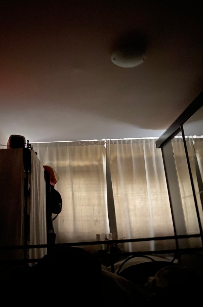 Naast het bed staat een tafeltje met geluiddempende oordopjes, slaapmasker, medicatie, vochtige washandjes, tandpoetsdoekjes, flesje water, een zoutlamp en mijn wandelstok.